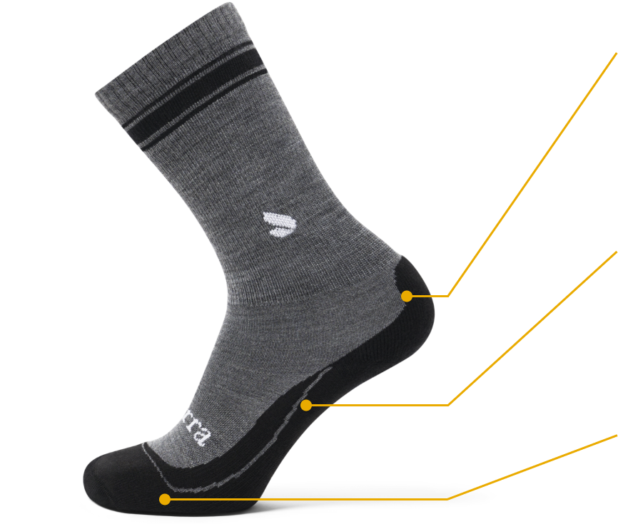 Our proprietary blend of merino wool and high performance moisture wicking yarns move sweat away from your skin and to the surface of the sock so that your feet stay dry.